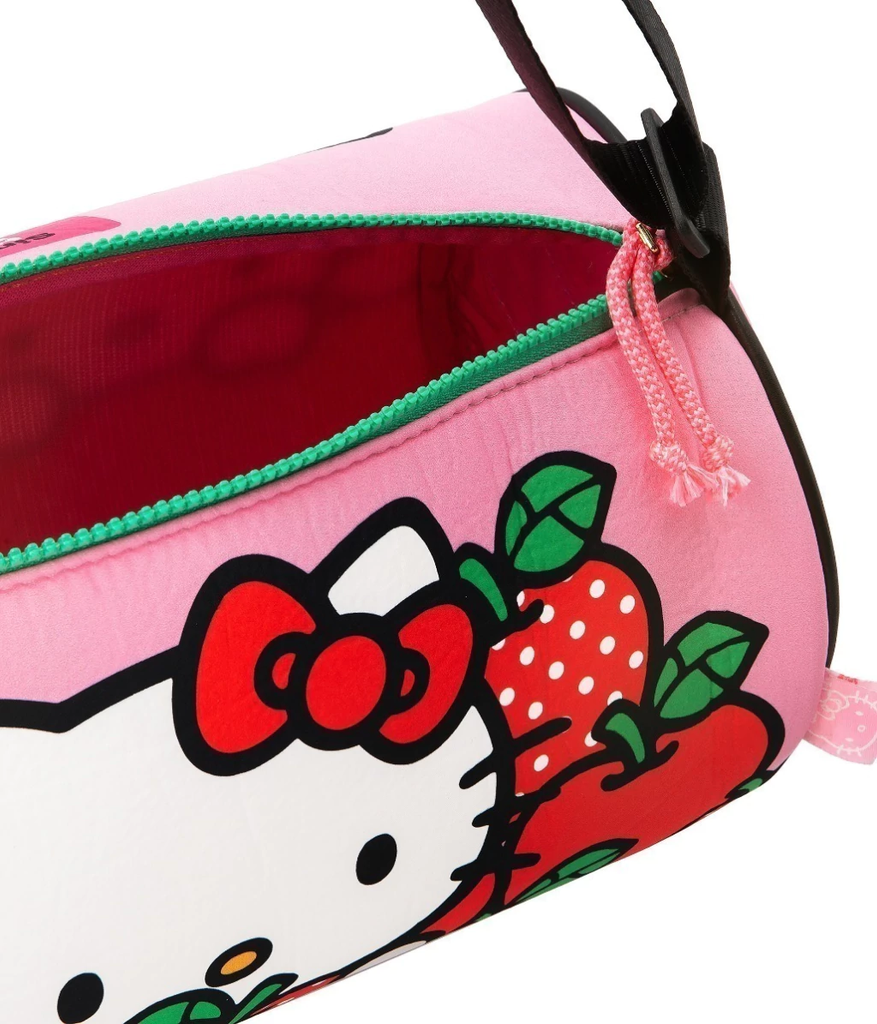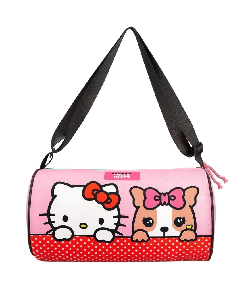 Sofía y Hello Kitty cada vez son más cercanas! Es el bolso ideal para una tarde con amigas, en su interior cuenta con dos bolsillos laterales, uno de red y otro de cristal que lo hace apto para ropa húmeda, para que guardes todo! Ideal para ir al club y tiene una correa regulable para que puedas adaptarla a tu medida. 32 cm (largo) x 18,5 cm (díametro) Amplitud máxima de correa 125 cm - Altura total: 7 cm Amplitud mínima de correa 66 cm - Altura total: 45 cm
