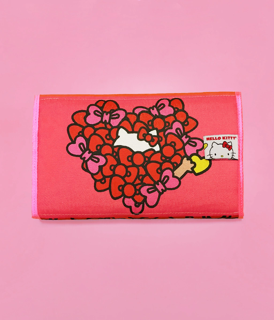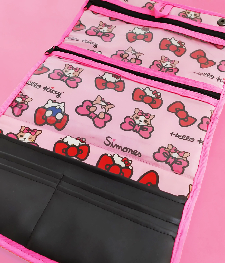 Para los amantes de los viajes y de Hello Kitty. Es el accesorio ideal para el bolso de viaje, tiene 2 compartimentos con cierre y uno con solapa con 6 espacios para tarjetas, además en un extremo tiene un loop para colgar. Confeccionado en cordura, una tela muy resistente! Las terminaciones son de PU soft. Prende con broches metálicos.