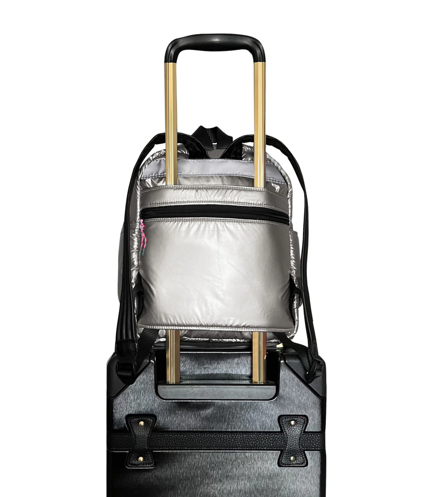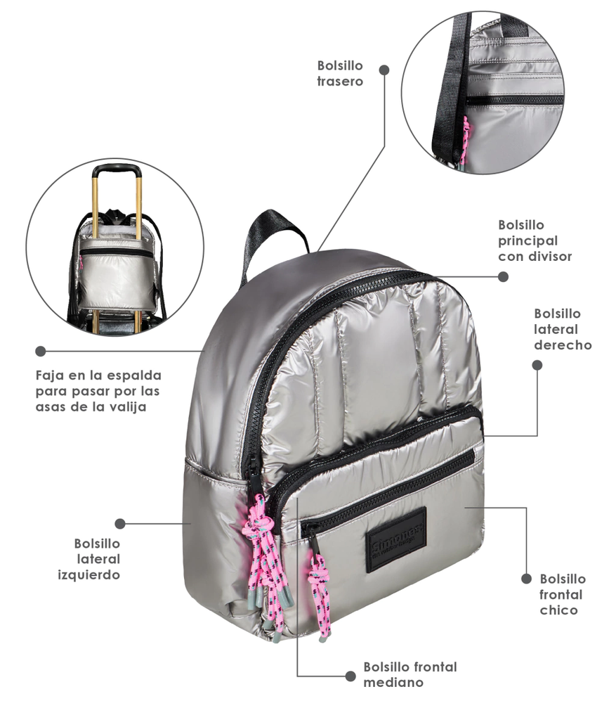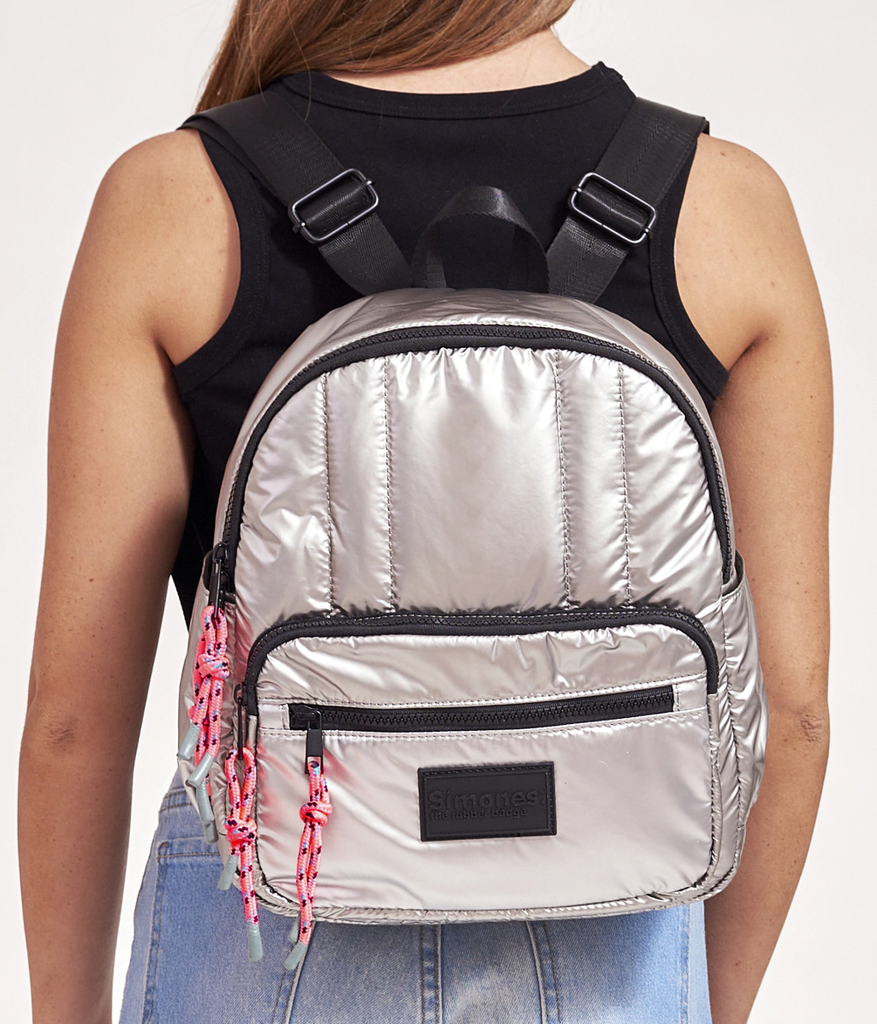 Travel in style, pack light, it's the new perfect match! Mochila Puffer confeccionada en siré Black y Silver. Dos colores que nunca pasan de moda y además son súper combinables con todo! Te vamos a contar lo que amamos de este productazo: . Es puffer, acolchada y liviana, fácil de compactar en viajes y fácil de limpiar. Win win . Está llena de bolsillos además de su acceso principal con cierre: 2 en el frente con cierre y dos laterales. En su interior tiene un compartimento divisor. . Tiene una faja en la espalda para que puedas pasar por las asas telescópicas de la valija que además le agregaremos un bolsillito con cierre para que tengas más a mano algunos items del viaje. Cool, no? . Sus manijas son muy confortables y sus cintas son regulables. . El cierre vislon y tiracierres de cordón que le dan el toque. Acerca de Simones Puffer: ¡Presentamos la nueva colección 2023! Renovamos colores y sumamos accesorios. Está pensada y diseñada desde el packaging hasta el producto, considerando a la persona como una amante de nuevas aventuras y viajes. Los productos son atemporales y funcionales sin perder estilo: esta serie se distingue con “the rubber badge'', la nueva etiqueta de goma de la colección. Además ahora incluye una funda con una estampa hermosa para que puedas guardarla en tu vestidor.