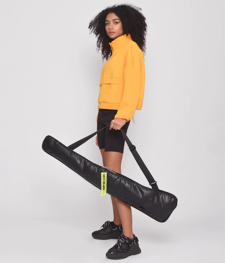 Portapalo de hockey, un accesorio funcional y renovado en esta versión súper cool de Pu negro con terminaciones matelassé en el frente. De efecto acolchado y con interior en siré negro. Tiene una correa regulable para colgar al hombro.