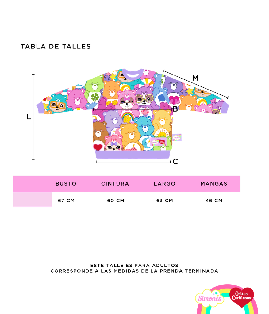 Este buzo talle único confeccionado en una tela súper soft, es ideal para un look loose & comfy. Tiene la estampa más CUTE de la Collab, es un sueño: todos los personajes son parte de este pattern mega colorido. Estamos felices de conectar a varias generaciones, Ositos Cariñosos fue parte de nuestra infancia y hoy están de vuelta, ¡los amamos! PREVENTA: Este producto se encuentra en proceso de producción y se despacha a partir de 15 días hábiles realizada tu compra.