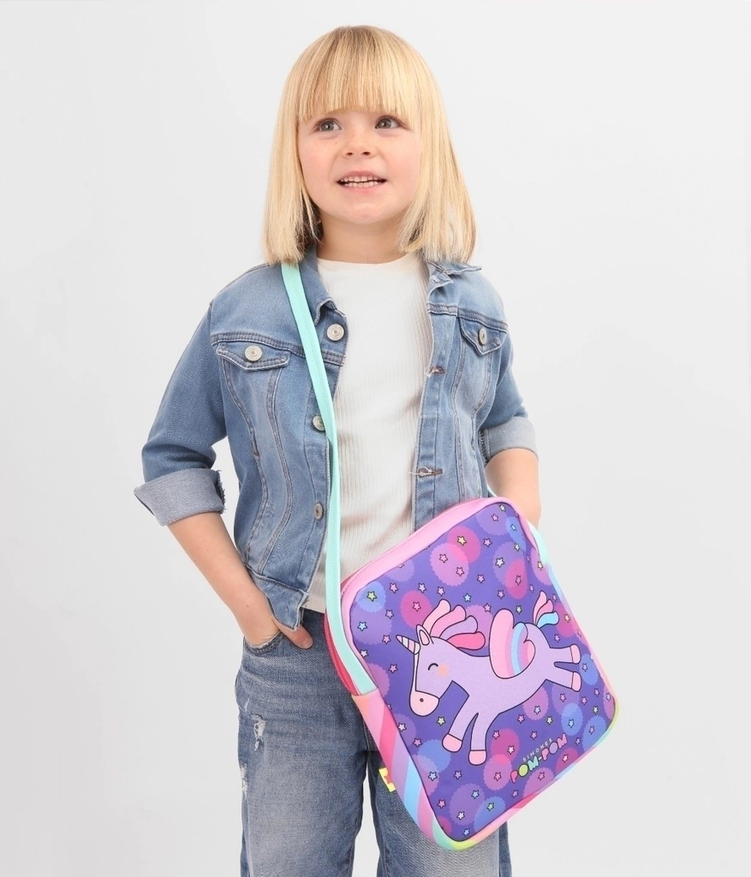 Colores, unicornios, estrellitas y Sofía Pom Pom! Esta bandolera plana lo tiene todo. Tiene una tira para colgar y un cordón en el extremo del cierre. También podés llevar tu tablet de hasta 10”. Confeccionada en Set Bond, una tela de efecto acolchado.