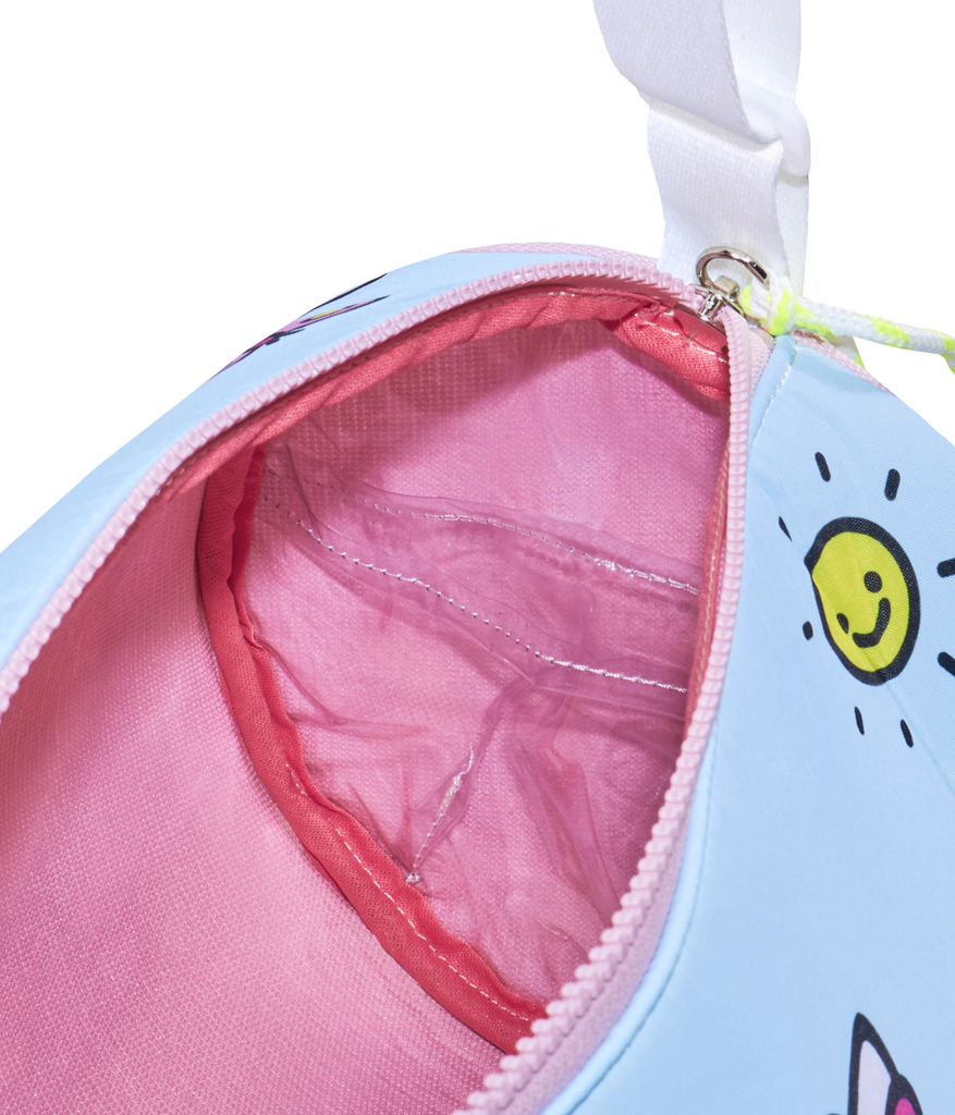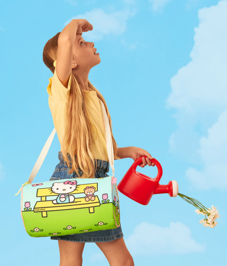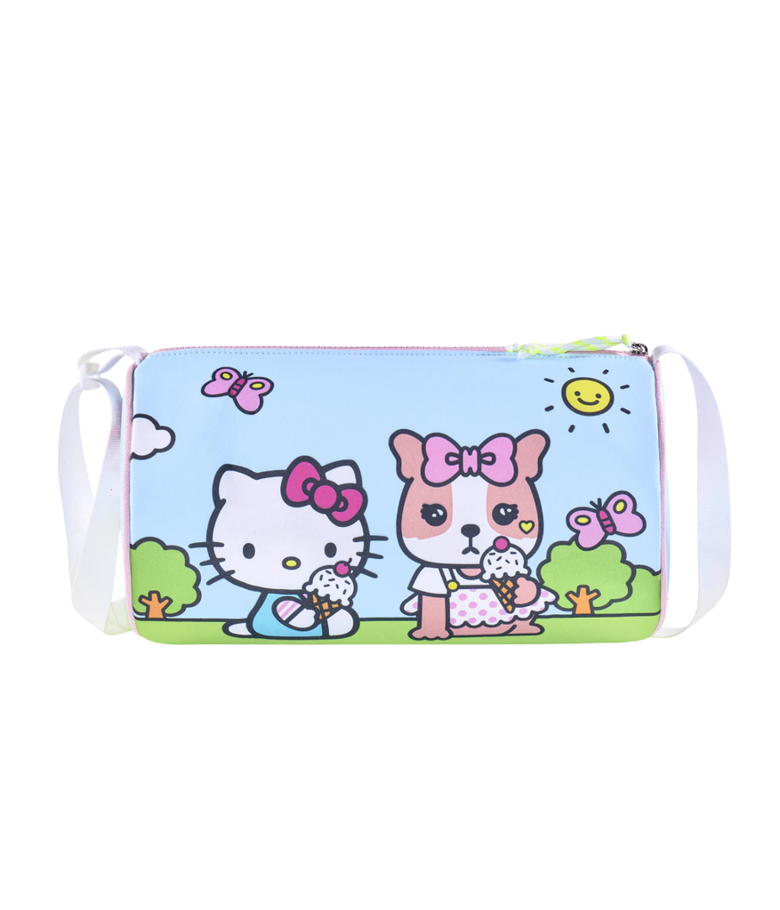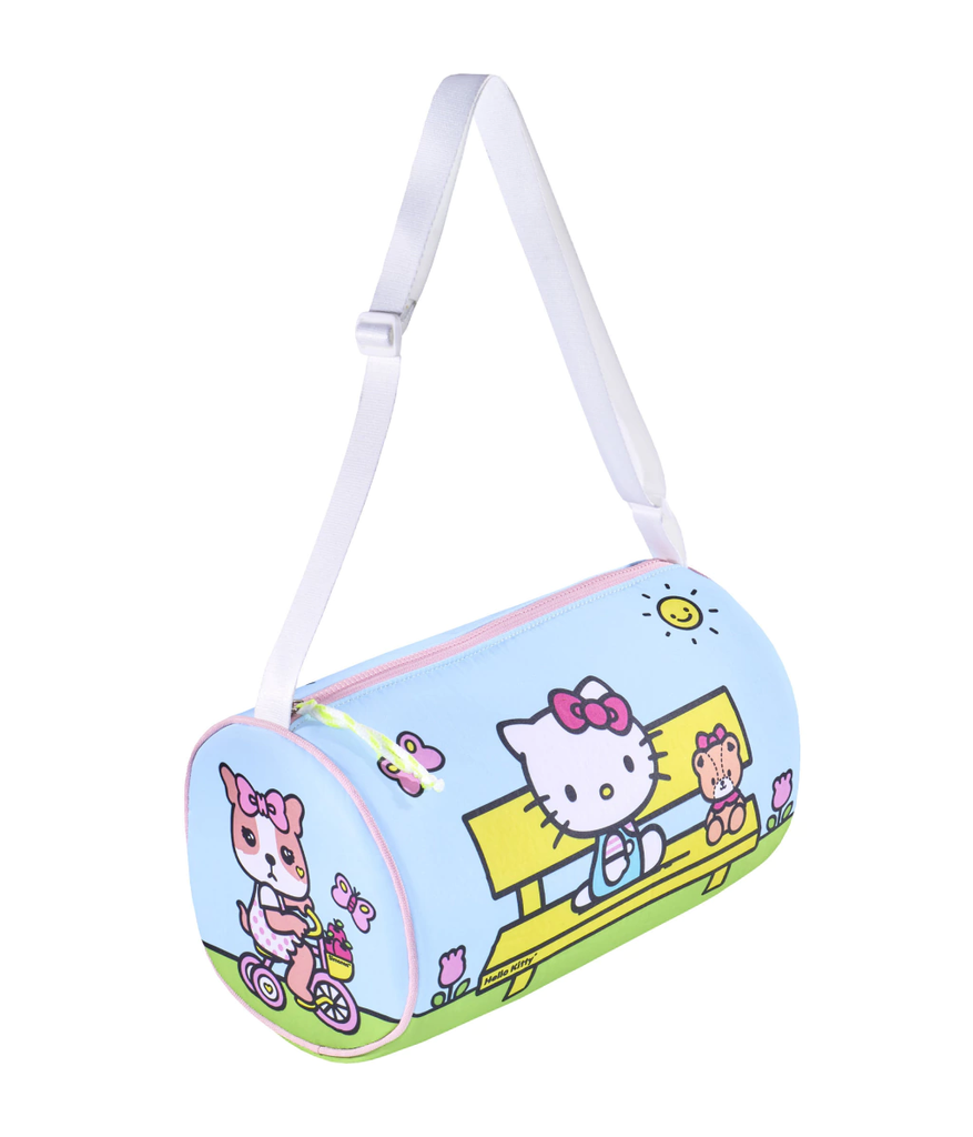 Sofía y Hello Kitty salen de paseo. Ahora son muy amigas :) Este bolso de formato tubular es un accesorio ideal para este verano. Genial para ir a la pile, al club a la colonia y a la playa!!! Es ideal para salir de paseo. Al deslizar el cierre se descubren dos compartimentos en cada lateral: tiene un bolsillo de red y el otro de pvc cristal para separar ropa húmeda. Amamos los detalles: la etiqueta tejida de esta Collab con Hello Kitty y el cordón de tiracierre. Su tira es regulable y se ajusta mediante una hebilla plástica , divino para llevar cruzado!!! Confeccionado en poliéster, una tela acolchada y muy resistente! Amplio, útil y muuuuy adorable.